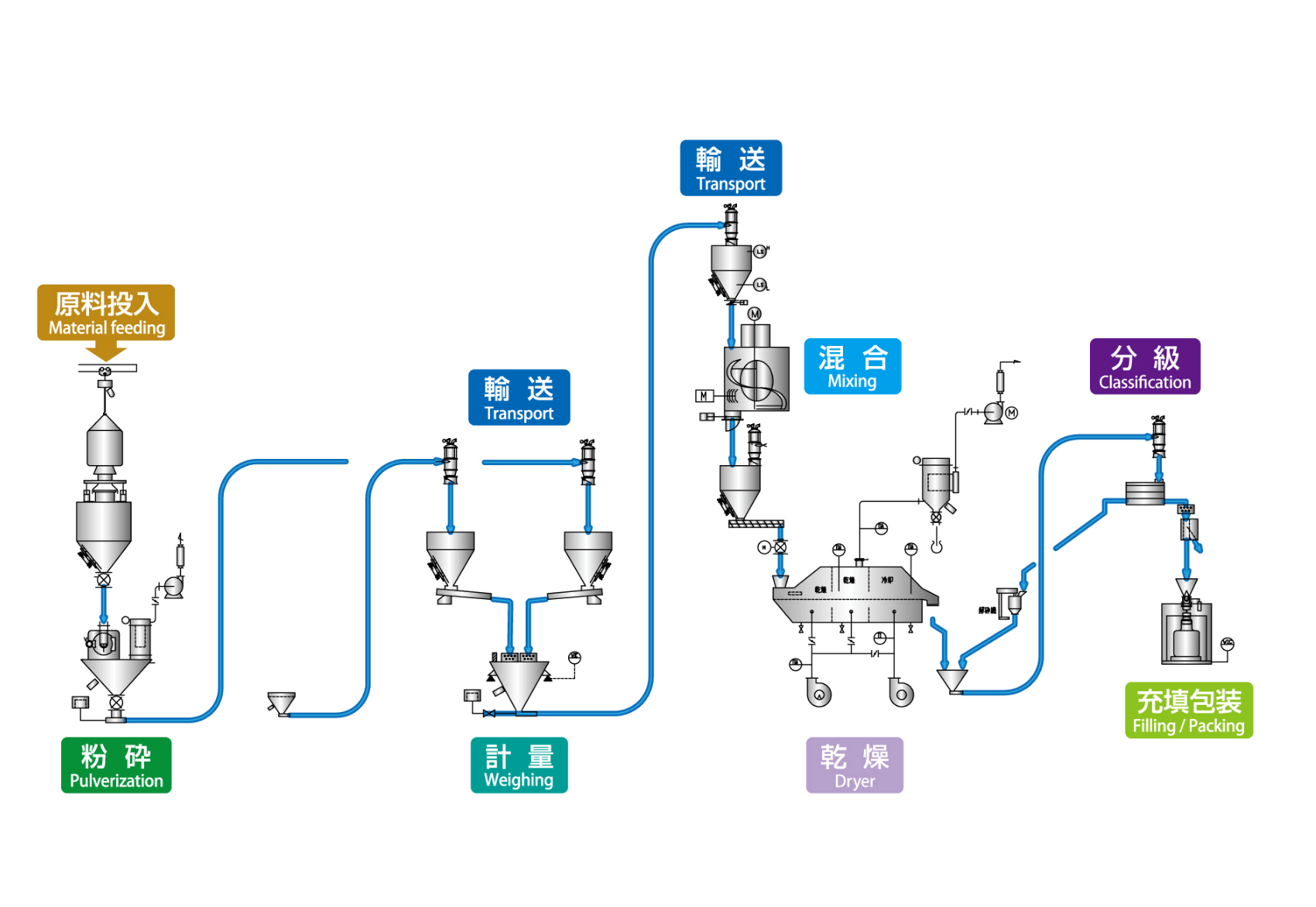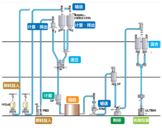 為動(dòng)力電池上游正負(fù)極材料企業(yè)提供包括投料,計(jì)量配料,燒結(jié),氣力輸送,粉碎,混合,篩分,包裝,提供無揚(yáng)塵省人力無異物混入的全自動(dòng)生產(chǎn)線。